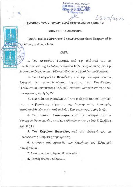 Ο ΑΡΤΕΜΗΣ ΣΩΡΡΑΣ ΜΕΤΑ ΑΠΟ ΤΗΝ ΕΞΩΔΙΚΗ ΔΗΛΩΣΗ- ΠΡΟΣΚΛΗΣΗ-ΔΙΑΜΑΡΤΥΡΙΑ ΠΟΥ ΚΑΤΕΘΕΣΕ ΣΕ ΟΛΟΥΣ ΤΟΥΣ ΑΡΜΟΔΙΟΥΣ ΦΟΡΕΙΣ, ΤΗΝ ΒΟΥΛΗ, ΤΑ ΚΟΜΜΑΤΑ ΚΑΙ ΤΟΥΣ ΑΝΕΞΑΡΤΗΤΟΥΣ ΒΟΥΛΕΥΤΕΣ ΚΑΙ ΑΦΟΥ ΚΑΝΕΙΣ ΔΕΝ ΑΠΑΝΤΗΣΕ ΑΙΤΙΟΛΟΓΗΜΕΝΑ, Ο ΑΡΤΕΜΗΣ ΣΩΡΡΑΣ ΠΡΟΧΩΡΗΣΕ ΚΑΤΑΘΕΤΟΝΤΑΣ ΜΗΝΥΤΗΡΙΑ ΑΝΑΦΟΡΑ ΚΑΤΑ ΑΠΑΝΤΩΝ ΒΟΥΛΕΥΤΩΝ, ΑΡΧΗΓΩΝ ΚΟΜΜΑΤΩΝ, ΚΑΤΑ ΤΟΥ ΤΟΤΕ ΠΡΟΕΔΡΟΥ ΤΗΣ ΔΗΜΟΚΡΑΤΙΑΣ ΚΑΡΟΛΟΥ ΠΑΠΟΥΛΙΑ, ΤΟΥ ΔΙΟΡΙΣΜΕΝΟΥ ΥΠΟΥΡΓΟΥ ΟΙΚΟΝΟΜΙΚΩΝ ΚΑΙ ΠΑΝΤΟΣ ΥΠΕΥΘΥΝΟΥ ΓΙΑ ΤΗΝ ΠΟΙΝΙΚΗ ΔΙΩΞΗ ΕΙΣ ΒΑΡΟΣ ΤΟΥΣ, ΓΙΑ ΕΣΧΑΤΗ ΠΡΟΔΟΣΙΑ, ΠΑΡΑΒΑΣΗ ΚΑΘΗΚΟΝΤΟΣ ΚΑΙ ΚΑΚΟΥΡΓΗΜΑΤΙΚΗ ΑΠΙΣΤΙΑ, ΖΗΤΩΝΤΑΣ ΑΠΟ ΤΗΝ ΔΙΚΑΙΟΣΥΝΗ ΝΑ ΠΡΑΞΕΙ ΤΑ ΔΕΟΝΤΑ.